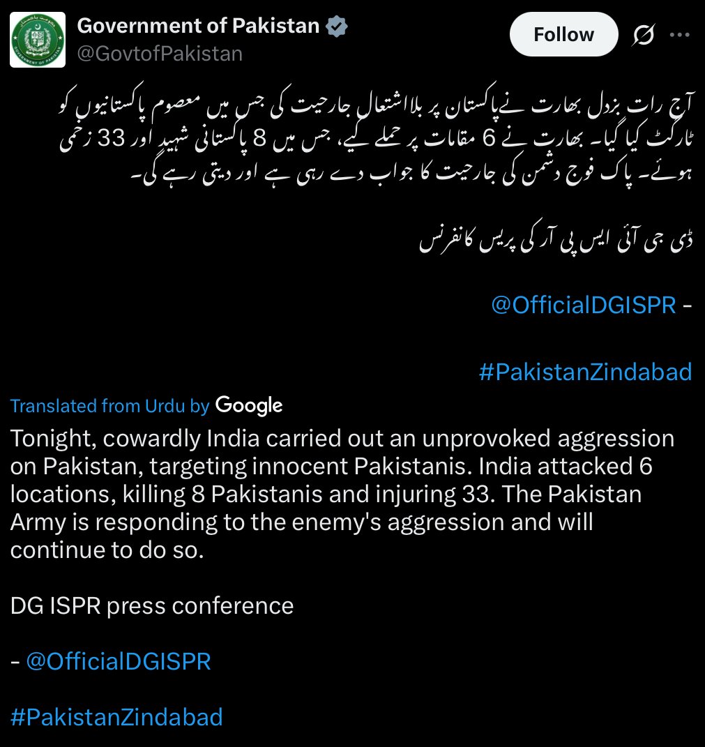 Tonight, cowardly India carried out an unprovoked aggression on Pakistan, targeting innocent Pakistanis. India attacked 6 locations, killing 8 Pakistanis and injuring 33. The Pakistan Army is responding to the enemy’s aggression and will continue to do so. DG ISPR press conference