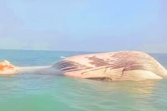 A blue whale, measuring approximately 35 feet in length, was found dead in Gwatar Bay…